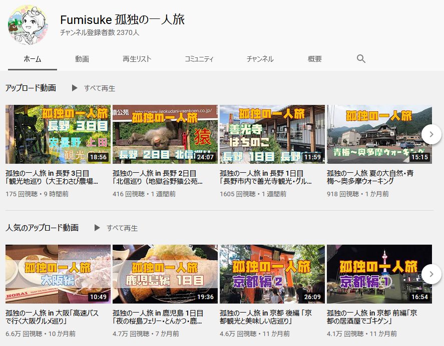 YouTubeでは旅行動画を投稿しており、2020年12月現在でチャンネル登録者数は約2,680人です。